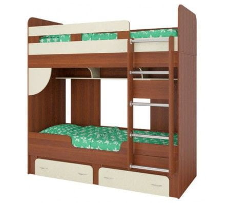 Кровать с усиленными ребрами жесткости. Для ступеней лестницы предусмотрены противоскользящие наклейки. 2 выкатных ящика и полочки над нижней кроватью позволяют разместить множество детских игрушек и книг.  Материалы: Вишня оксфорд / Крем Итальянский орех/Крем Каркас: ЛДСП 16 мм Фасады ящиков: ЛДСП 16 мм Кромка наружных элементов: АБС Выкатные ящики: на роликовых опорах Размеры спального мест: 0.8 х 1.95