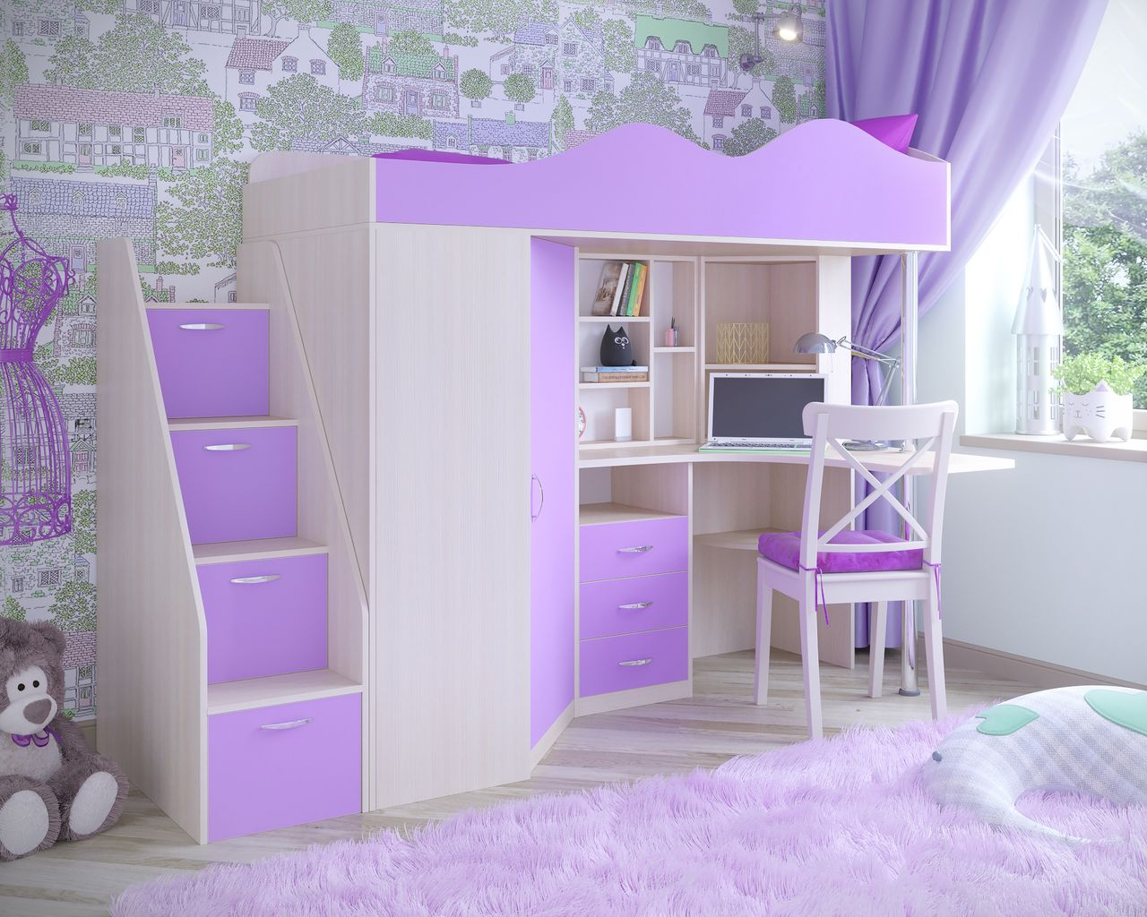 Защитный борт имеет волнообразную форму, что придает мебели оригинальность. Под спальным местом находится большая учебная зона. Письменный стол с тумбой – основное рабочее место, за которым ребенок будет старательно выполнять домашние задания. Стол угловой, встроенный, внизу имеет небольшую открытую полку. Высота стола – 72 сантиметра. Сбоку тумба, в ней три выдвижных ящика. Над столом располагается целых семь открытых навесных полочек различных размеров. В них можно хранить книги, небольшие игрушки, будильник и многое другое. Сбоку под спальным местом встроен угловой большой шкаф. В него наверняка поместится вся одежда ребенка.