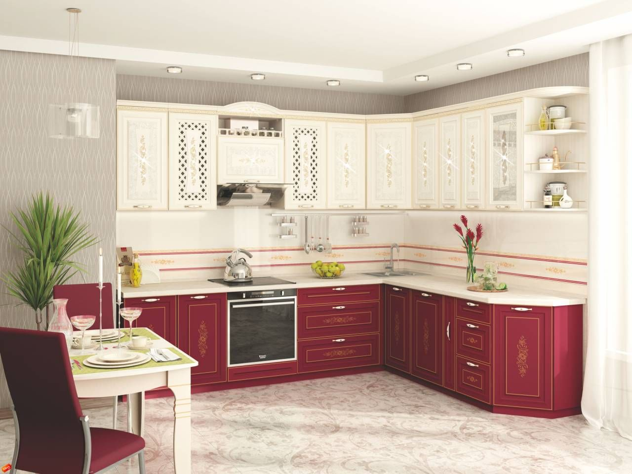 Новинка от фабрики Витра - модульная кухня Виктория, выполненная в цветовом стиле: цвет корпуса: сосна «Астрид», цвет фасадов шкафов: «Ваниль»; цвет фасадов столов: «Бордо».