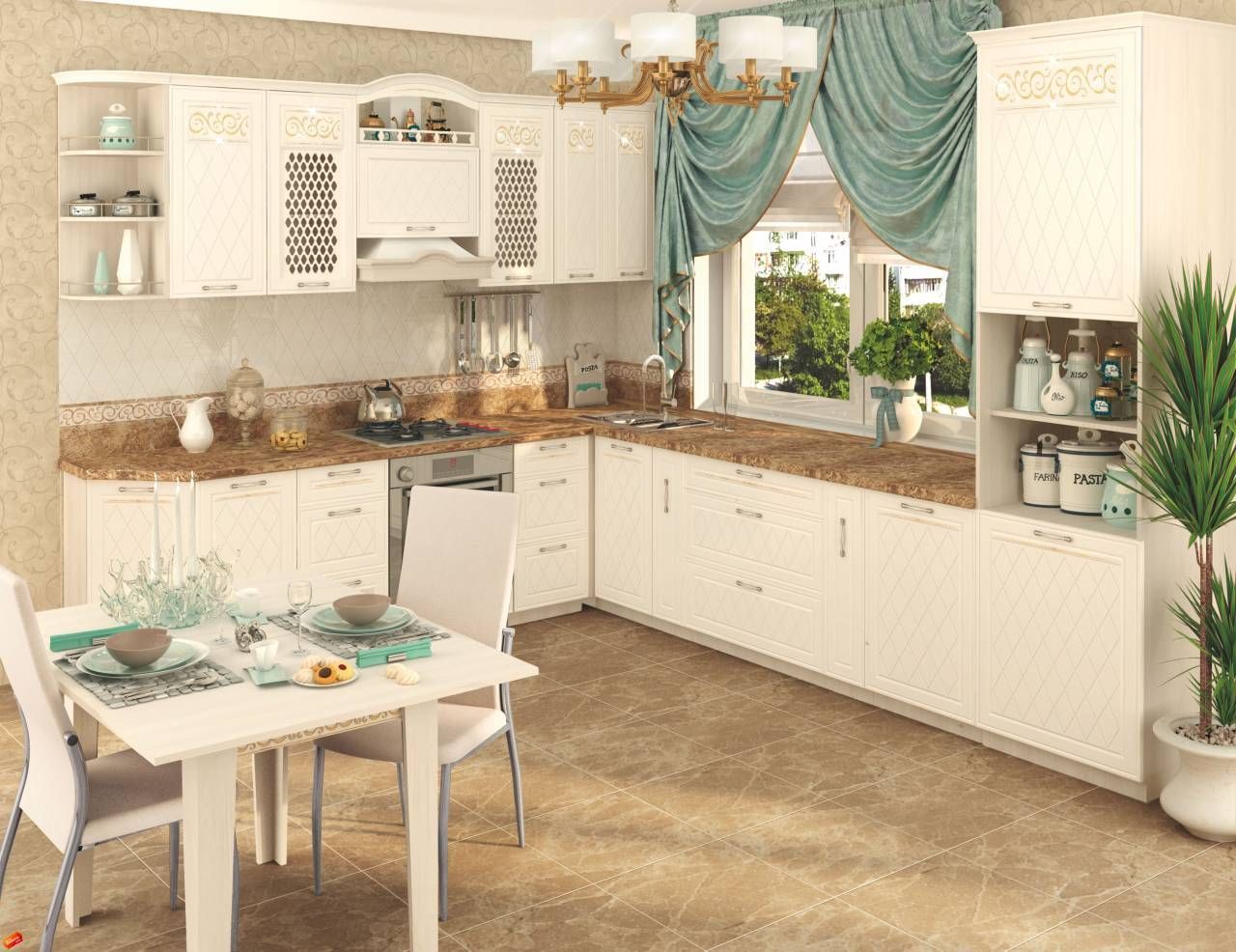 Набор мебели для кухни «Тиффани» — воплощение итальянского стиля и роскоши. Нежная белизна фасадов и изысканность декора очарует даже самого требовательного покупателя. Гармоничное сочетание светлого корпуса и фасадов зрительно увеличит пространство кухни.