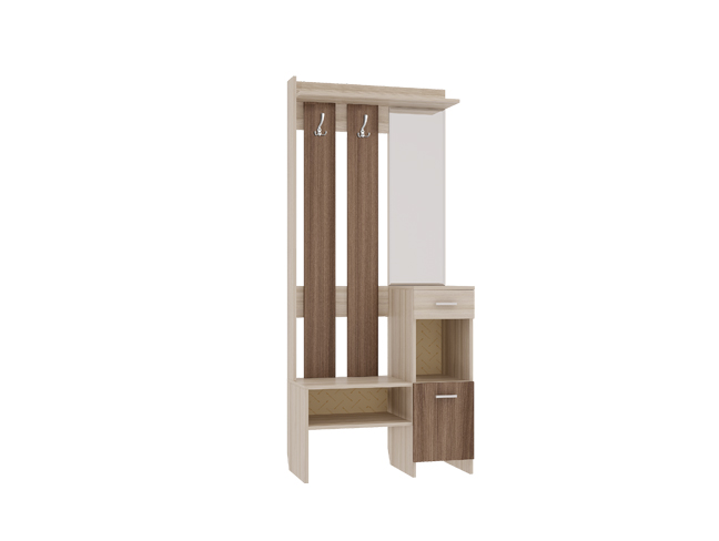 - Состоит из вешалки с крючками для одежды, обувницы, открытых полок, зеркала, полки для головных уборов, выдвижного ящика, закрытой ниши.