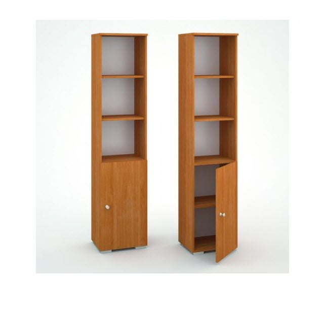 Шкаф для книг с дверью изготовлен из ламинированной ДСП толщиной 16 мм. Для улучшения внешнего вида и увеличения срока службы изделия торцы деталей обработаны кромкой ПВХ. Модель оборудована открытыми и закрытыми полками и установлена на пластиковые опоры.