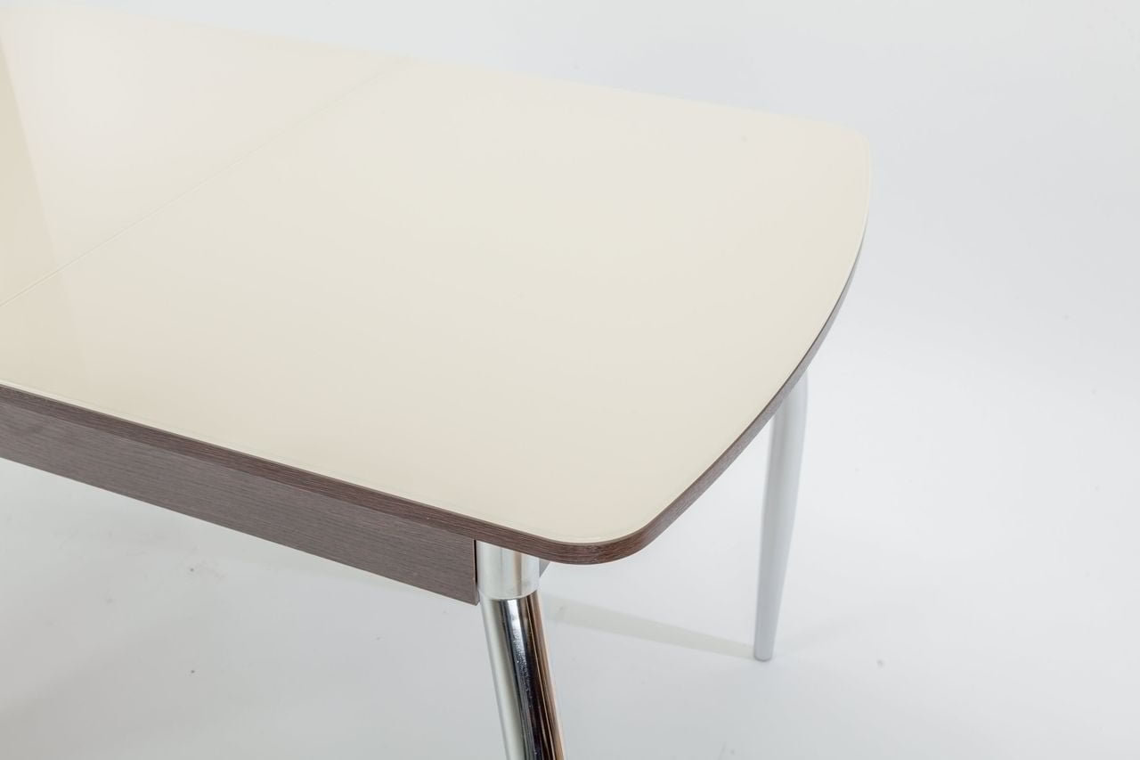 Механизм раскладки- синхронно -раздвижной (бабочка). В разложенном виде стеклянные половинки столешницы разделяет вставка из ДСП. Интересное сочетание в исполнение столешницы ДСП и закаленного стекла придаст шарм вашей кухне.